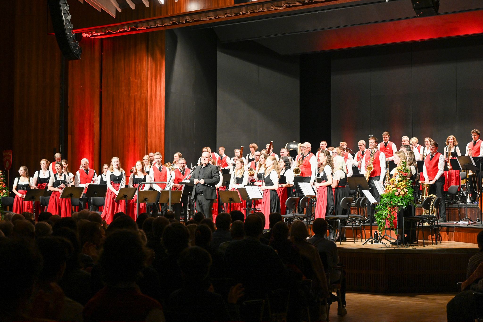 Bereits im Foyer sorgten die „Musikschlümpfe“ für den musikalischen Empfang. Den Auftakt auf der Bühne gestaltete die Jugendblaskapelle unter der Leitung von Peter Weber mit einem modernen Programm aus Filmmusik und sinfonischen Klängen. Anschließend führte das Sinfonische Blasorchester das Publikum mit Auszügen aus Johan de Meijs „Symphony No. 1 – The Lord of the Rings“ in eine vielschichtige Klangwelt.