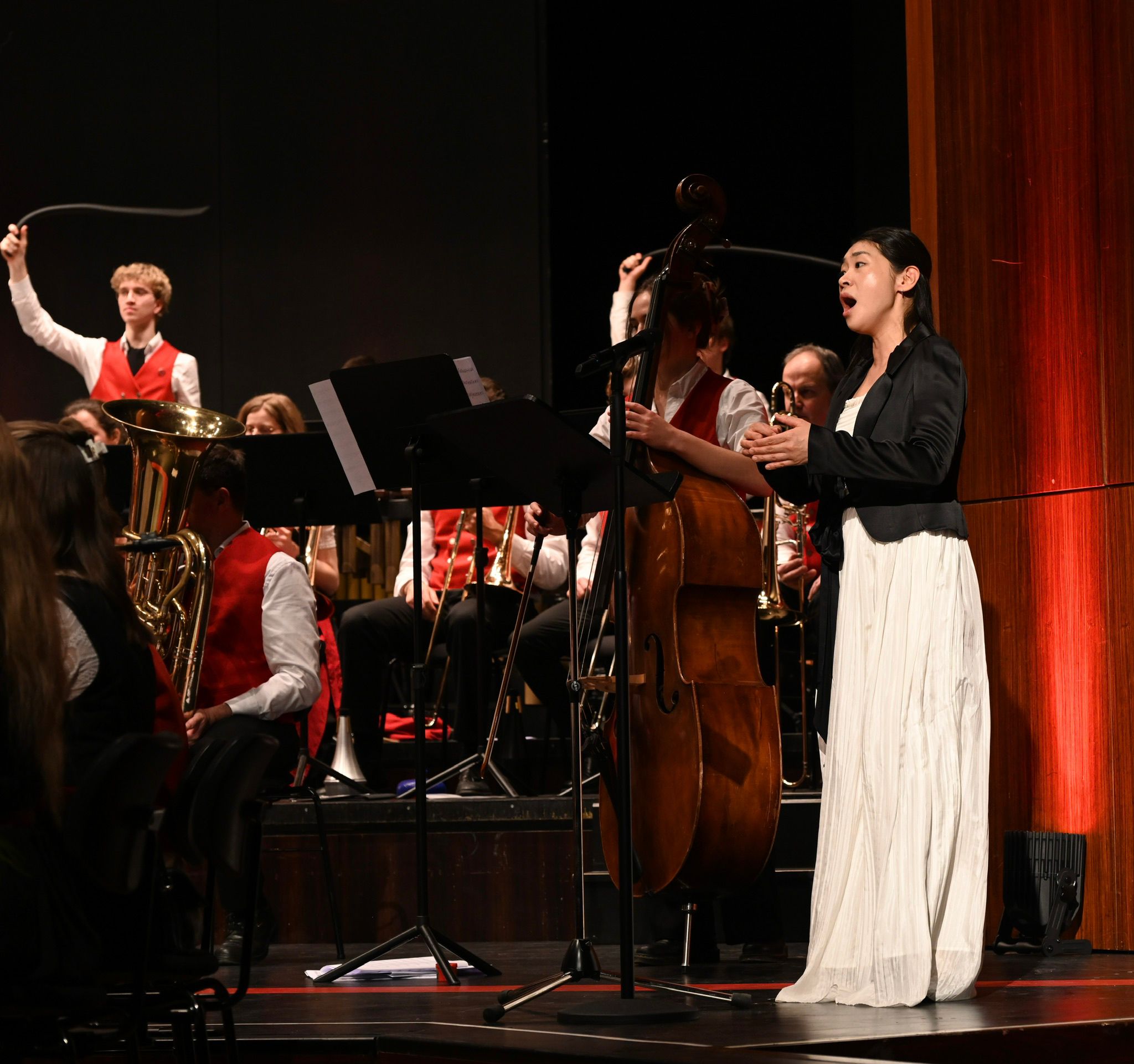 Besonders eindrucksvoll war die Aufführung von „Angels in the Architecture“ von Frank Ticheli. Das Orchester zeichnete dabei den Kontrast zwischen dramatischer Klanggewalt und der klaren, solistischen Stimme von Gastsängerin Cecilia Roh-Nyqvist eindrucksvoll nach. Das Zusammenspiel sorgte für einen der emotionalen Höhepunkte des Abends.