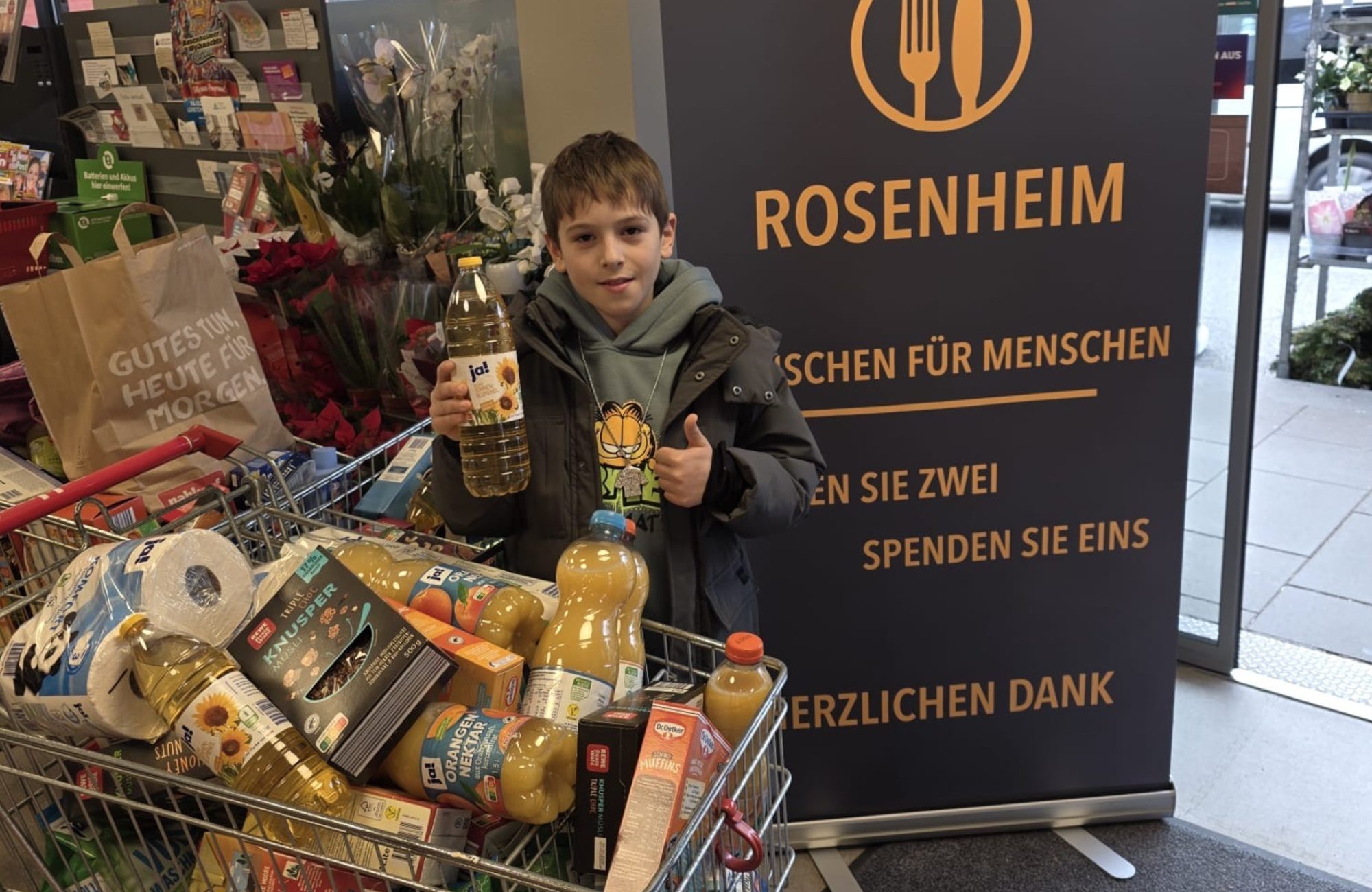 Bei der vorweihnachtlichen Aktion sammelt die Tafel Rosenheim haltbare Lebensmittel für ihre Kunden. Während eines Einkaufs wurde der junge Samuel gemeinsam mit seiner Mutter auf die Möglichkeit aufmerksam, zusätzlich Produkte für die Tafel zu erwerben.