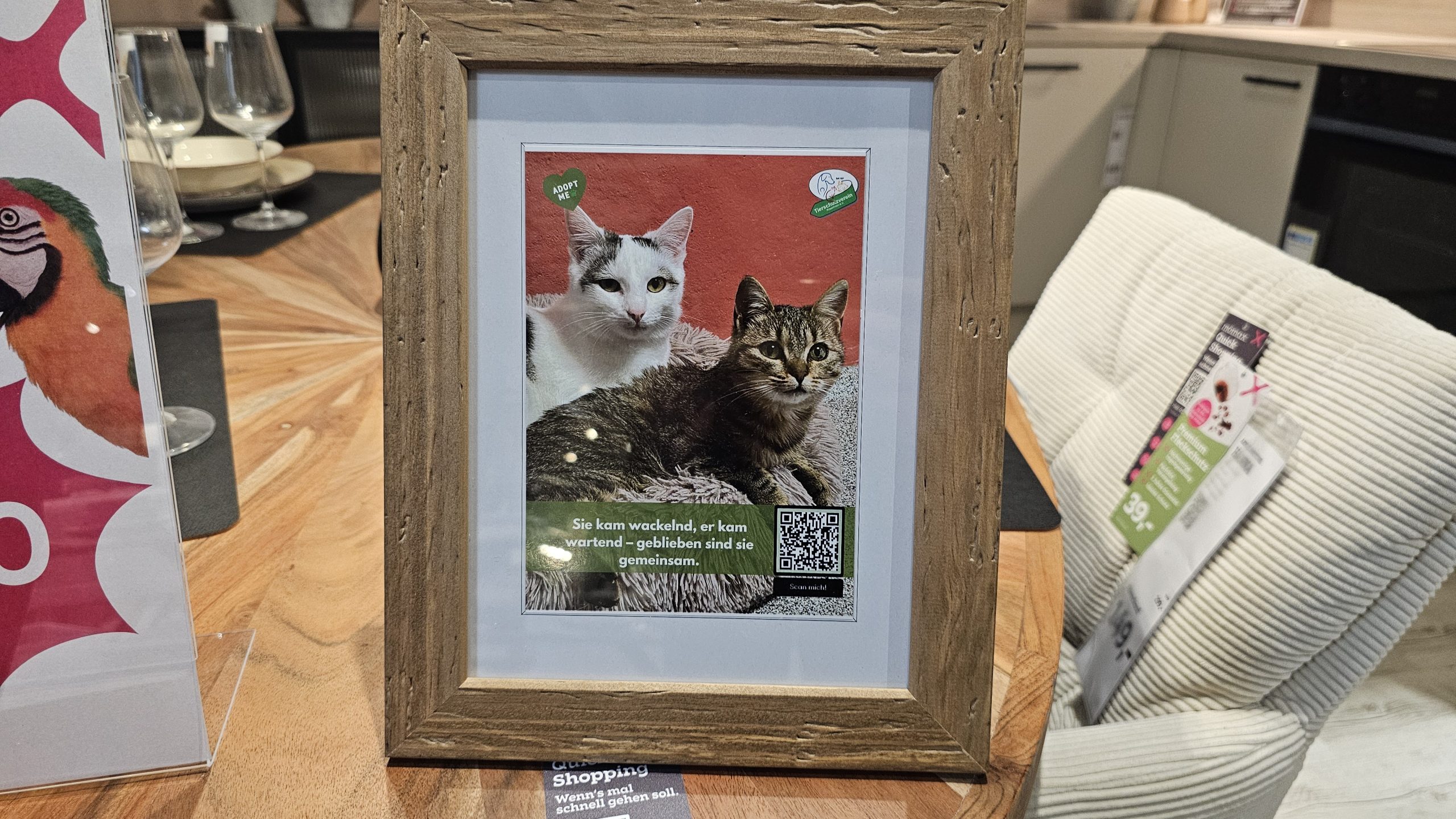 Wer aktuell durch die Mömax-Ausstellung in Rosenheim schlendert, entdeckt an verschiedenen Stellen entzückende Fotos von Katzen und Hunden, die sehnsüchtig auf ein neues Zuhause warten. Zum Beispiel: Zwei Miezen, die treuherzig in die Kamera blicken. Unter jedem Bild steht ein humorvoller, herzlicher Spruch – etwa bei einem Katzenduo: „Sie kam wackelnd, er kam wartend – geblieben sind sie gemeinsam.“ Verlieben ausdrücklich erlaubt: Wer sich Hals über Kopf in „Snoopy“ und „Camilla“ verguckt, kann per QR-Code sofort mehr über die beiden erfahren. Camilla lebt mit Ataxie, das heißt, sie ist an manchen Tagen etwas wackelig auf den Beinen – aber voller Lebensfreude, Schmuselust und Spielfreude. Und: Sie kann nicht ohne Snoopy, der ebenfalls als Fundkatze ins Rosenheimer Tierheim kam.