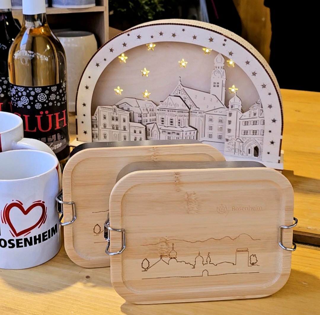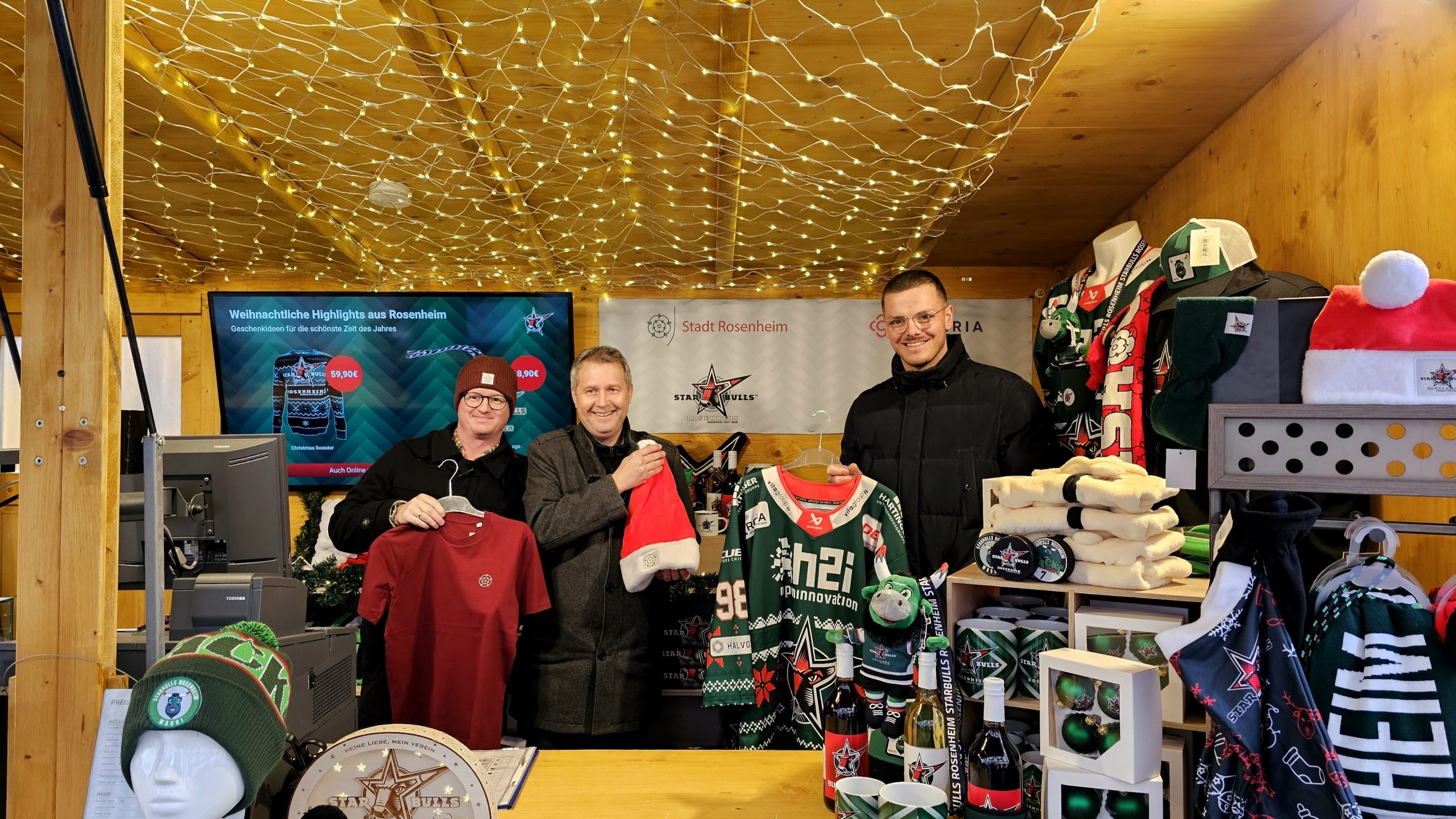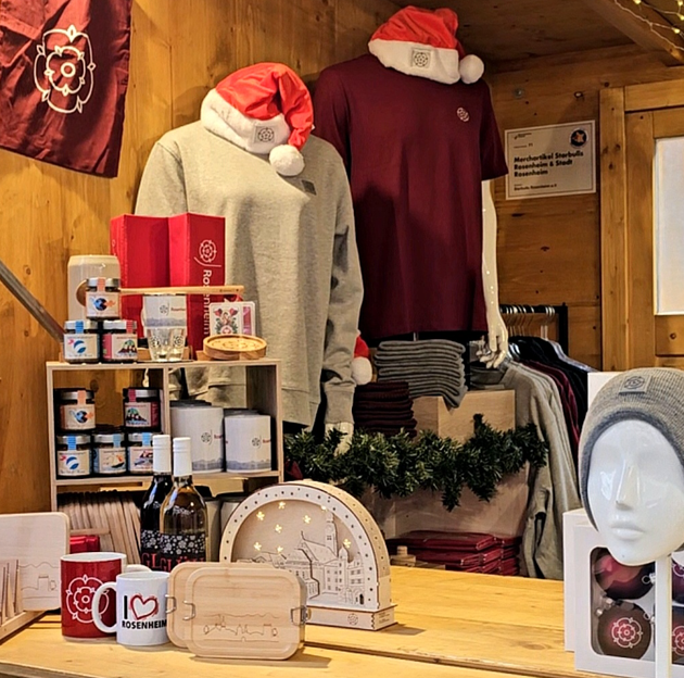 Und dann gibt es noch den Gemeinschaftsstand von Galeria, Stadt Rosenheim und den Starbulls. Angeboten werden dort unter anderem exklusive Starbulls-Weihnachtstrikots und Brotzeitboxen, Tassen, Shirts und Weihnachtsdeko mit der Rosenheimer Rose als Logo. Organisiert wird der Verkauf von Galeria, die Produktpalette kommt von Stadt und Eishockeyverein. Die Nachfrage sei bisher „sehr gut“, so die Verkäufer dort.