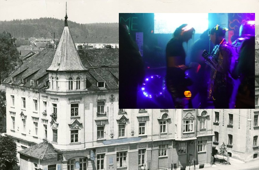Die alte Aufnahme zeigt das Gebäude, in dem die Asta-Kneipe seit 50 Jahren beheimatet ist im Jahr 1971. Foto: Archiv Herbert Borrmann. Eingeblockt ist ein Bild einer Cyberparty bei der Asta vor 2 Jahren. Foto: Innpuls.me