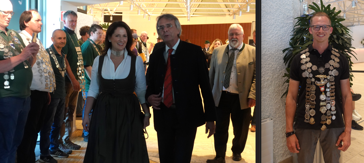Staatsministerin Michaela Kaniber und Fischer-Präsident Axel Bartelt schreiten durch das Spalier der Fischerkönige im Foyer des Kultur- und Kongresszentrums Rosenheim. Fotos: Innpuls.me