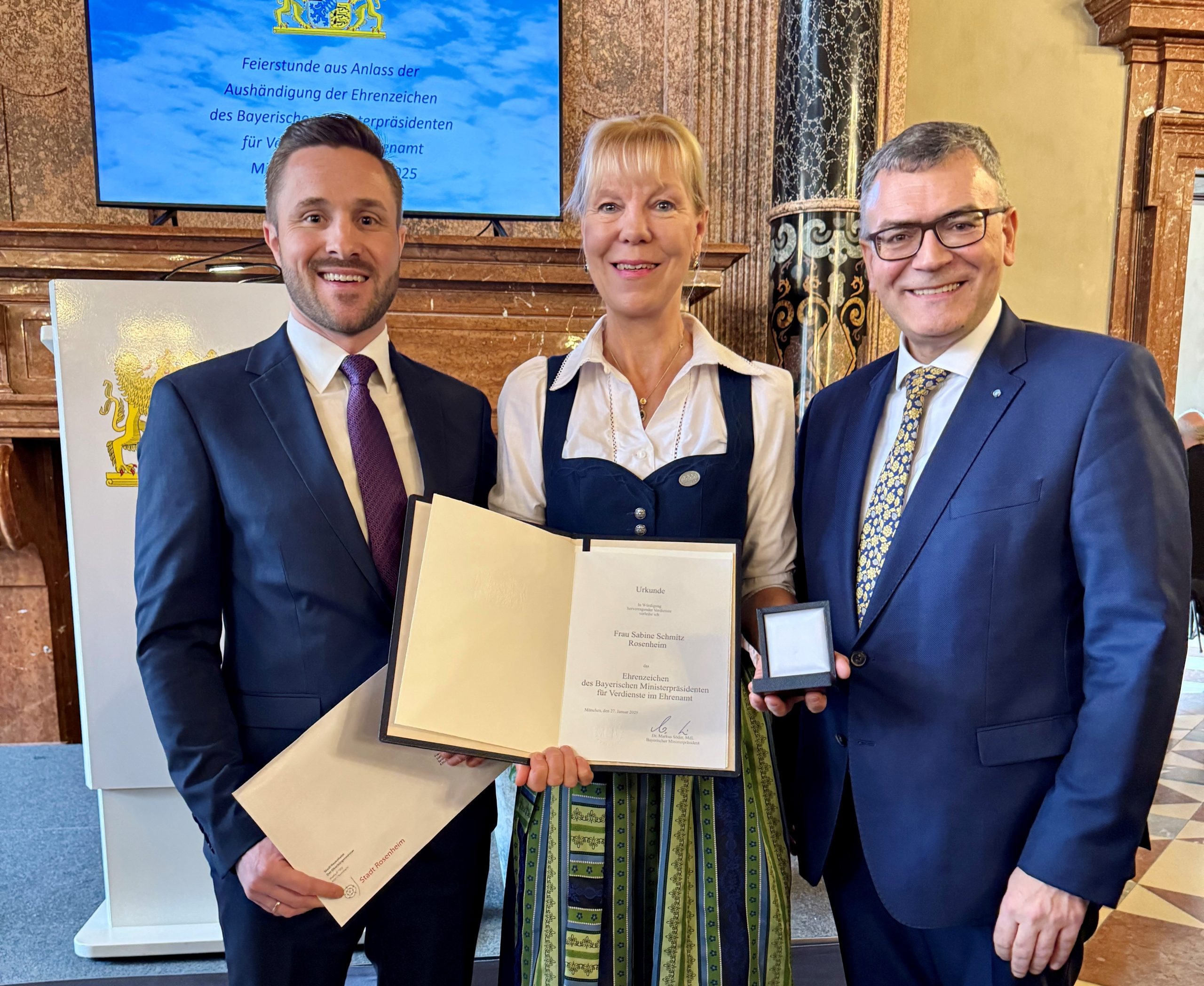 Im festlichen Kaisersaal der Münchner Residenz wurde Sabine Schmitz aus Rosenheim/Happing von Staatsminister Dr. Florian Herrmann das Ehrenzeichen des Bayerischen Ministerpräsidenten für ehrenamtliches Engagement ausgehändigt.