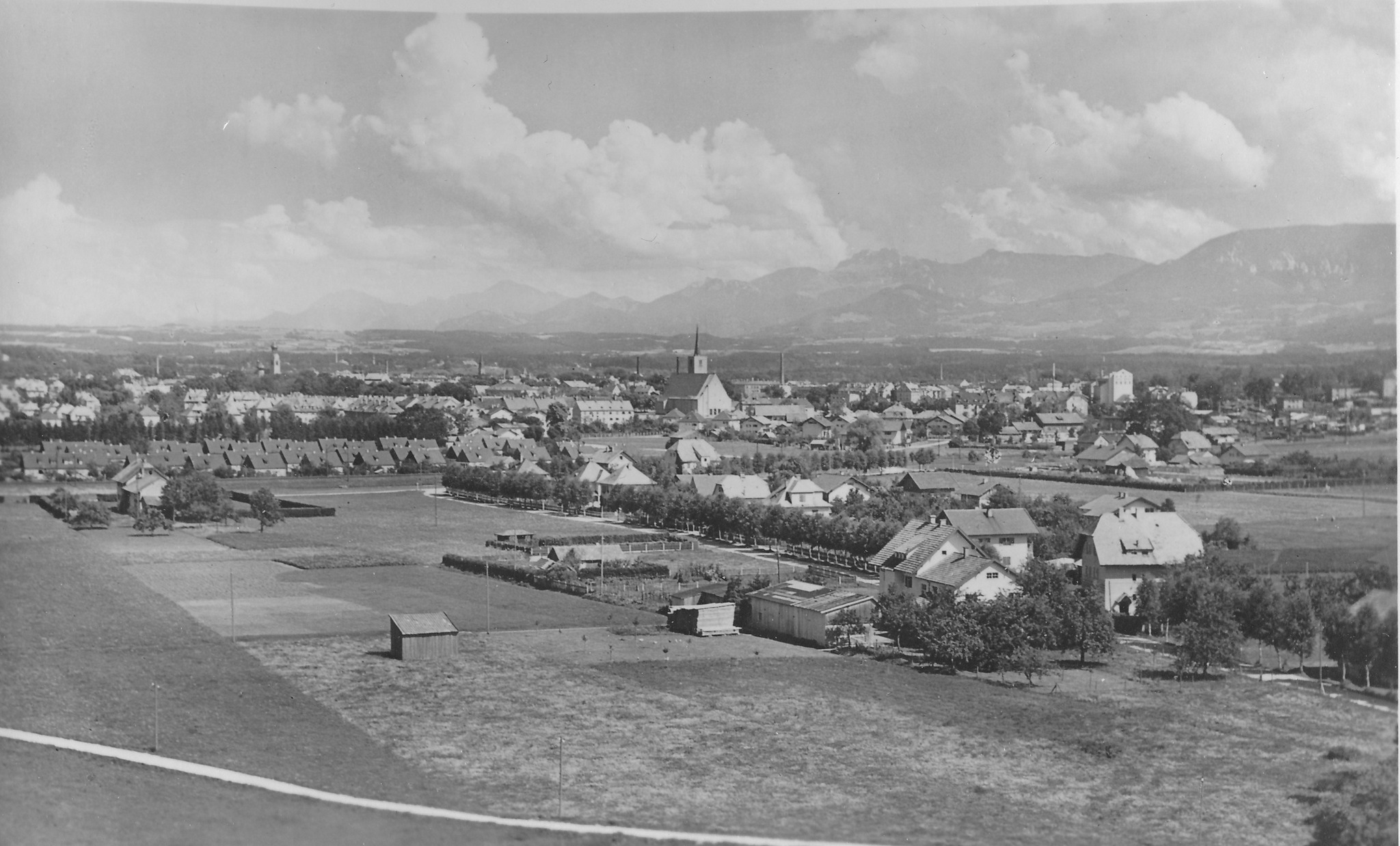 Das Bild ist in jedem Fall vor 1950 entstanden, erkennbar am Zustand des Turms der Nikolauskirche mit nur einem Schallfenster (bei entsprechender Vergrößerung leicht zu sehen). Auch der Bebauungszustand der Küpferlingstraße und der Meranerstraße lässt mich eher auf einen Zeitpunkt während des 2.Weltkriegs oder kurz danach tippen. Die von den Nazis erbaute „KdF-Siedlung“ an der Sudetenlandstraße (im Volksmund in meiner Kindheit „Schachtelhausen“ genannt) steht jedenfalls schon.