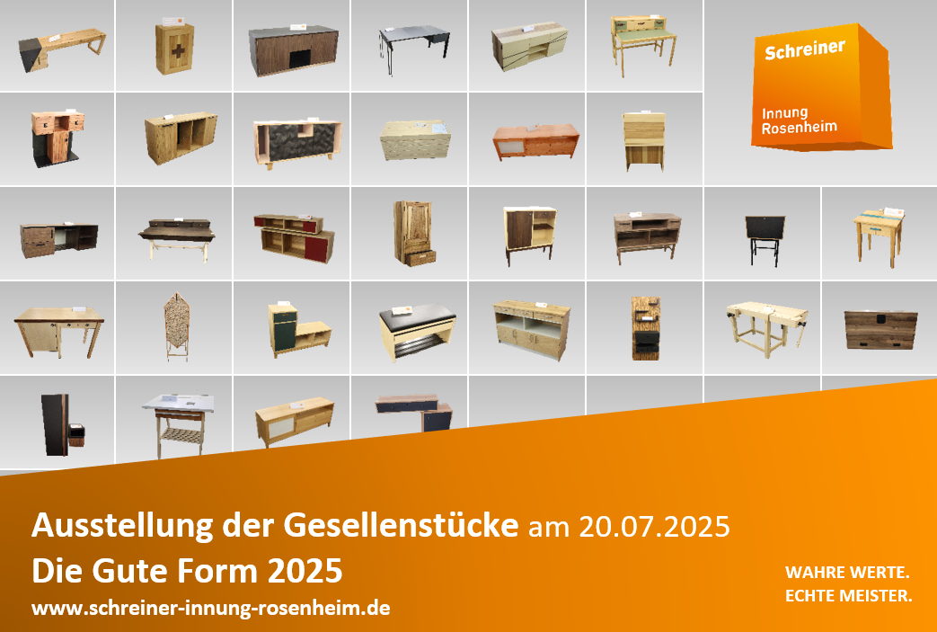 Rosenheim – Junge Handwerkskunst auf höchstem Niveau: die Schreiner-Innung Rosenheim präsentiert am morgigen Sonntag 20. Juli, von 10 bis 15 Uhr die Gesellenstücke 2025 in der Aula der Berufsschule 1 in Rosenheim (Prinzregentenstraße 68). Einritt frei, keine Anmeldung erforderlich.