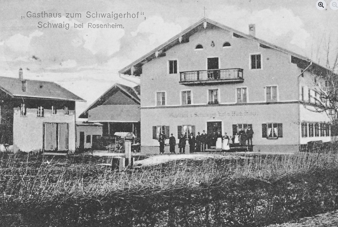 Wir konnten leider zu dieser alten Aufnahme nicht viel herausfinden. Der Gasthof in der Schwaig in Rosenheim war wohl auch ein Treffpunkt für einige Rosenheimer Vereine. Wer weitere Infos dazu hat, wie immer gerne unter dem Fotooldie kommentieren.