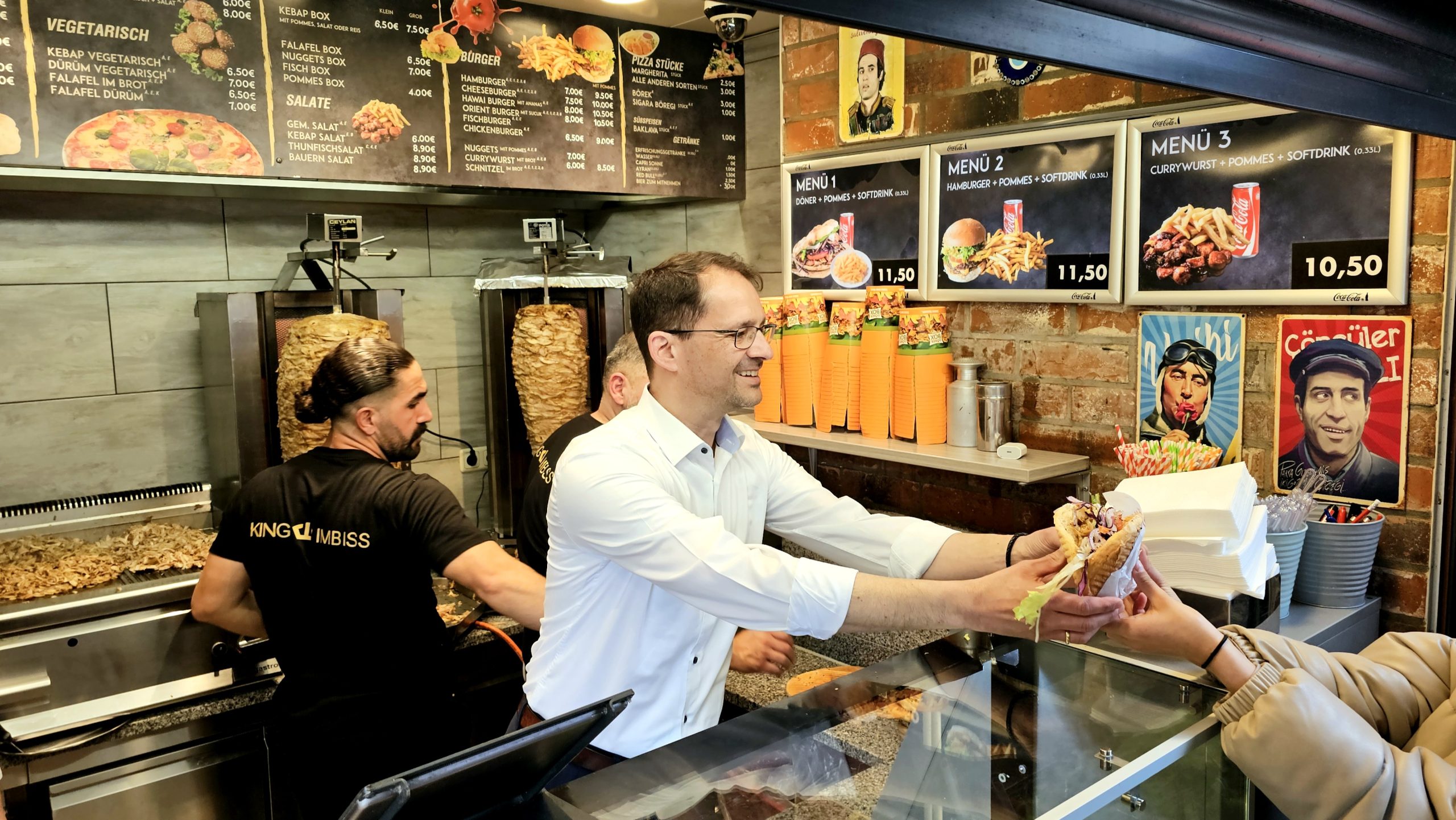 Rosenheims Oberbürgermeister Andreas März – statt im Rathaus diesmal im Dönerstand. Fotos: Josefa Staudhammer