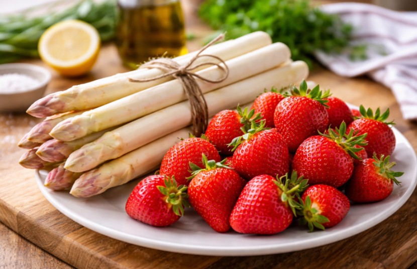 Erdbeeren und Spargel auf einem Teller. Foto: Symbolfoto ai generiert