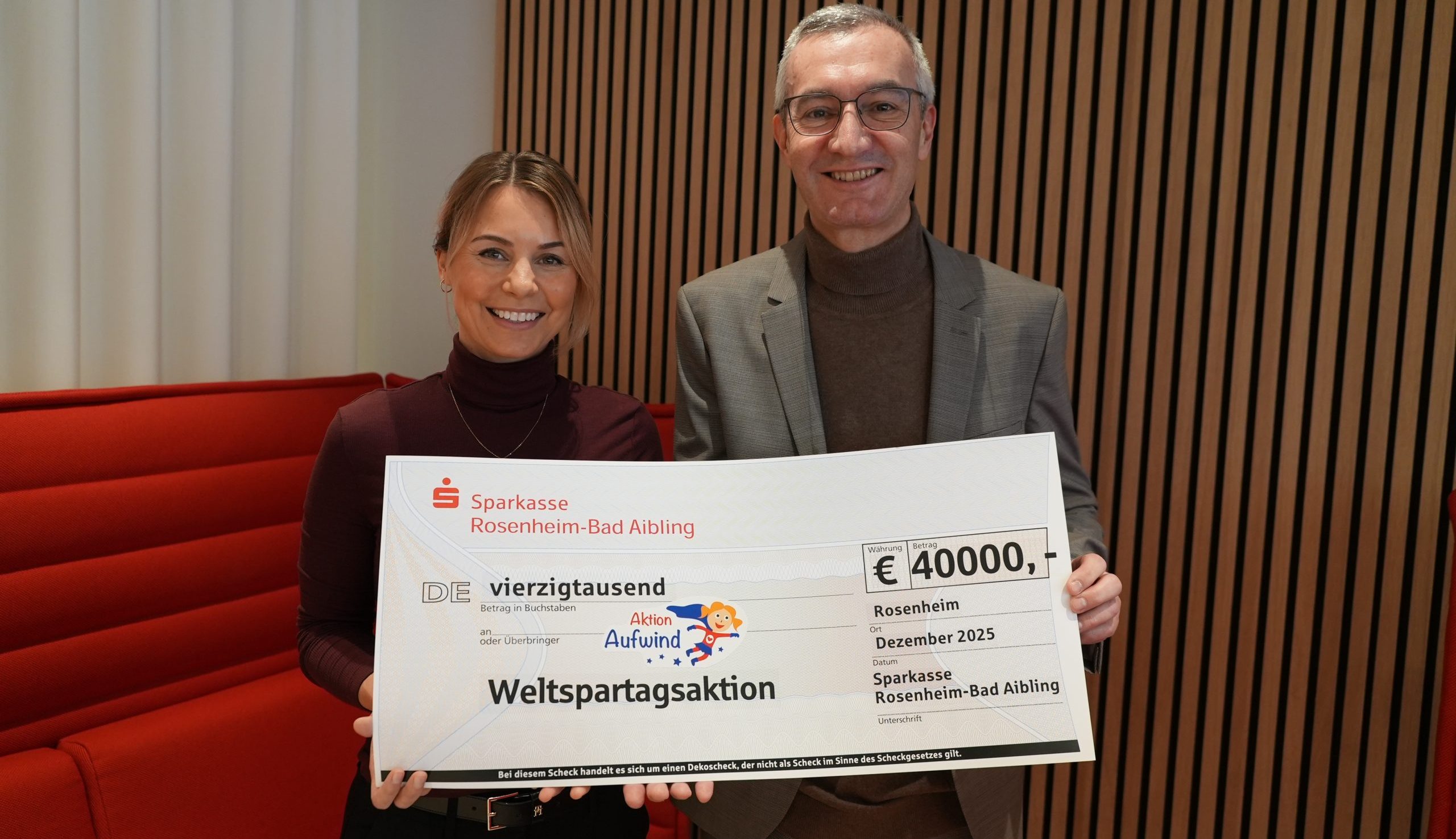 Rosenheim – Großzügige Unterstützung für Familien in der Region: Die Sparkasse Rosenheim-Bad Aibling hat im Rahmen der Weltsparwochen 40.000 Euro an die Aktion Aufwind gespendet. Mit der Summe werden Kinder und Jugendliche aus finanziell belasteten Familien schnell und unbürokratisch unterstützt.