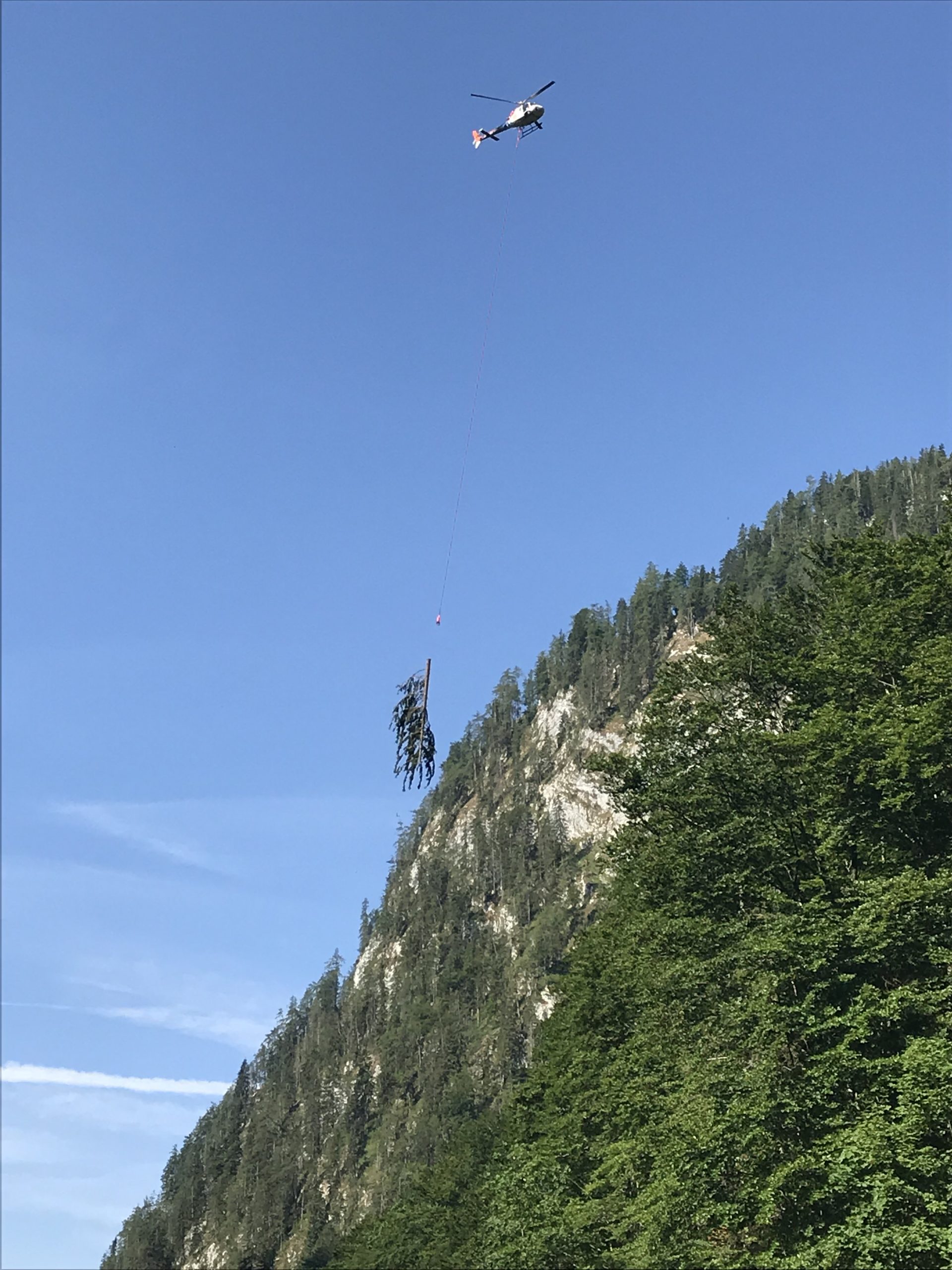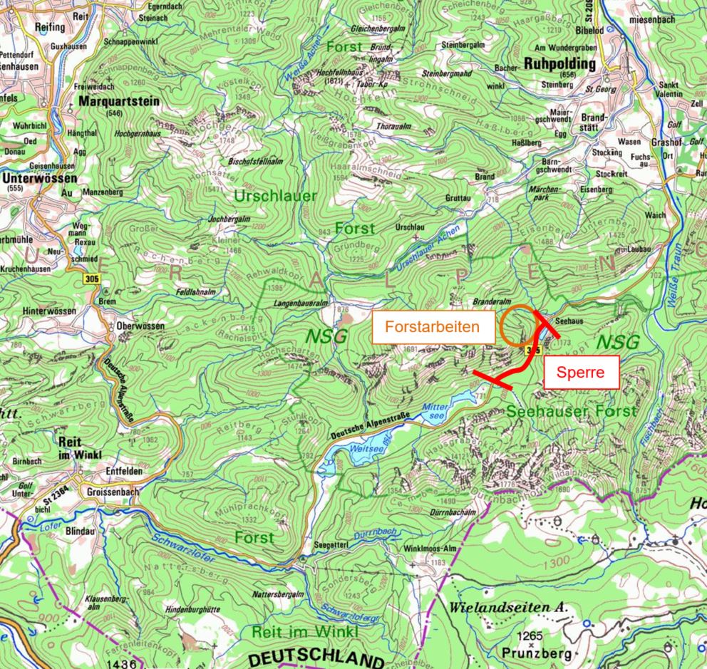 Ruhpolding / Reit im Winkl / Landkreis Traunstein – Am Donnerstag, 5. Juni werden zwischen Seehaus und Seegatterl entlang der Bundesstraße B 305 Forst- und Felsberäumungsarbeiten zur Erhaltung der Verkehrssicherheit durchgeführt. Durch die komplexen Arbeiten im Steilgelände ist der Einsatz eines Hubschraubers erforderlich. Aus Sicherheitsgründen muss die Bundesstraße während der Flugzeiten gesperrt werden.
