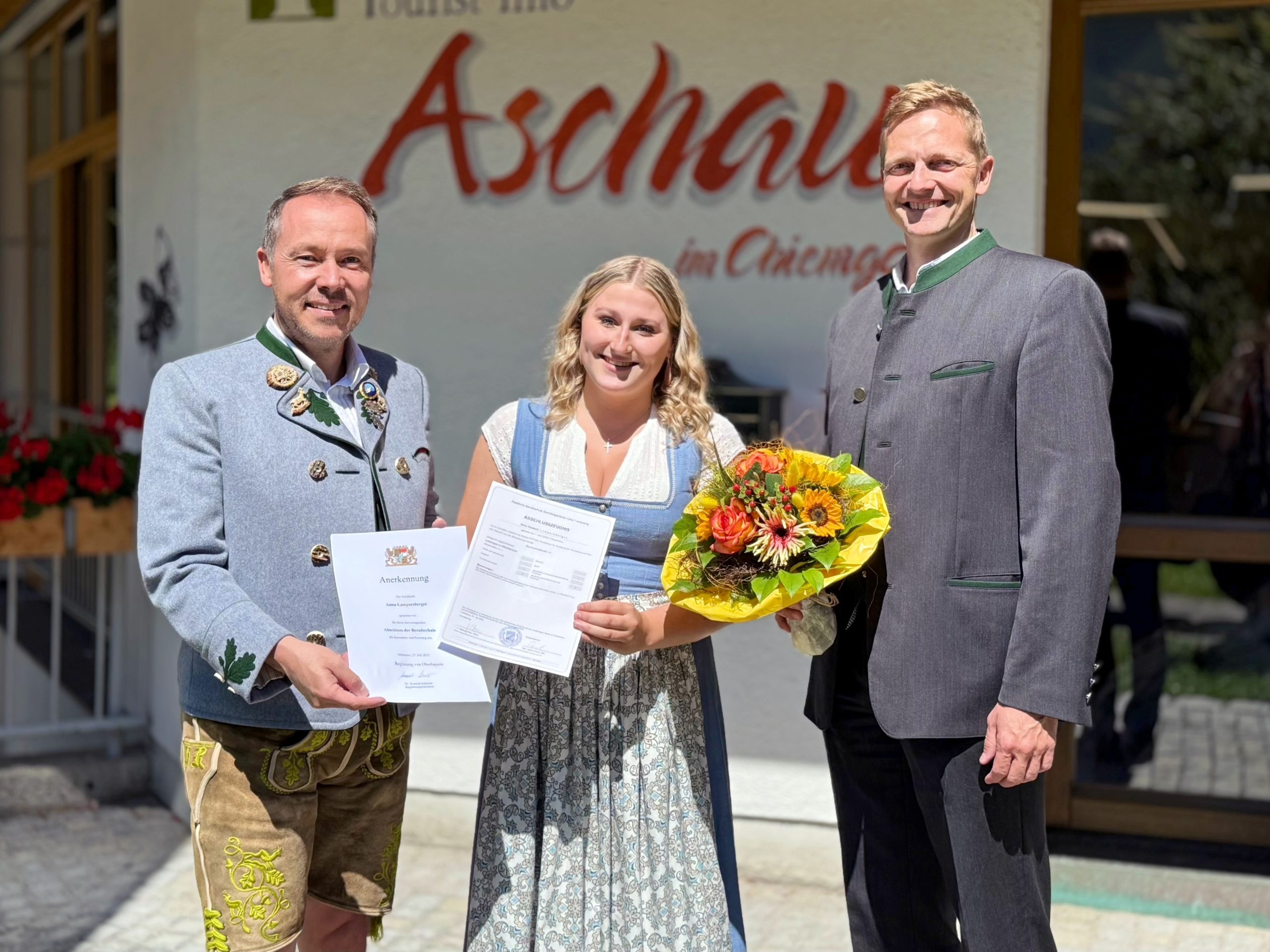 Die junge Tourismuskraft konnte ihren Schulabschluss mit der Traum-Gesamtnote 1 abschließen. Bei einer kleinen Feierstunde in der Aschauer Tourist Info würdigte Erster Bürgermeister Simon Frank (Rechts), den hervorragenden Schulabschluss von Anna Lampersberger (Mitte) im touristischen Ausbildungsberuf. Selbstverständlich wurde die junge „Spitzen-Touristikerin“ auch von Ausbilder, Herbert Reiter (Links), von der Tourist Info Aschau im Chiemgau zum Erfolg beglückwünscht. Besonders große Freude herrscht dabei über die ausgehändigte Anerkennungsurkunde zum Staatspreis von Oberbayerns Regierungspräsident, Dr. Konrad Schober. Im Fokus der Abschlussprüfungen standen unter anderem die Fächer Kaufmännische Steuerung und Kontrolle, Tourismusprozesse, Fremdsprache sowie Betriebliche und gesamtwirtschaftliche Prozesse, in denen Anna Lampersberger mit großem Fachwissen und Engagement überzeugte. Anna Lampersberger wird das Team der Tourist Info auch künftig tatkräftig unterstützen und bleibt so ein Teil des Teams.