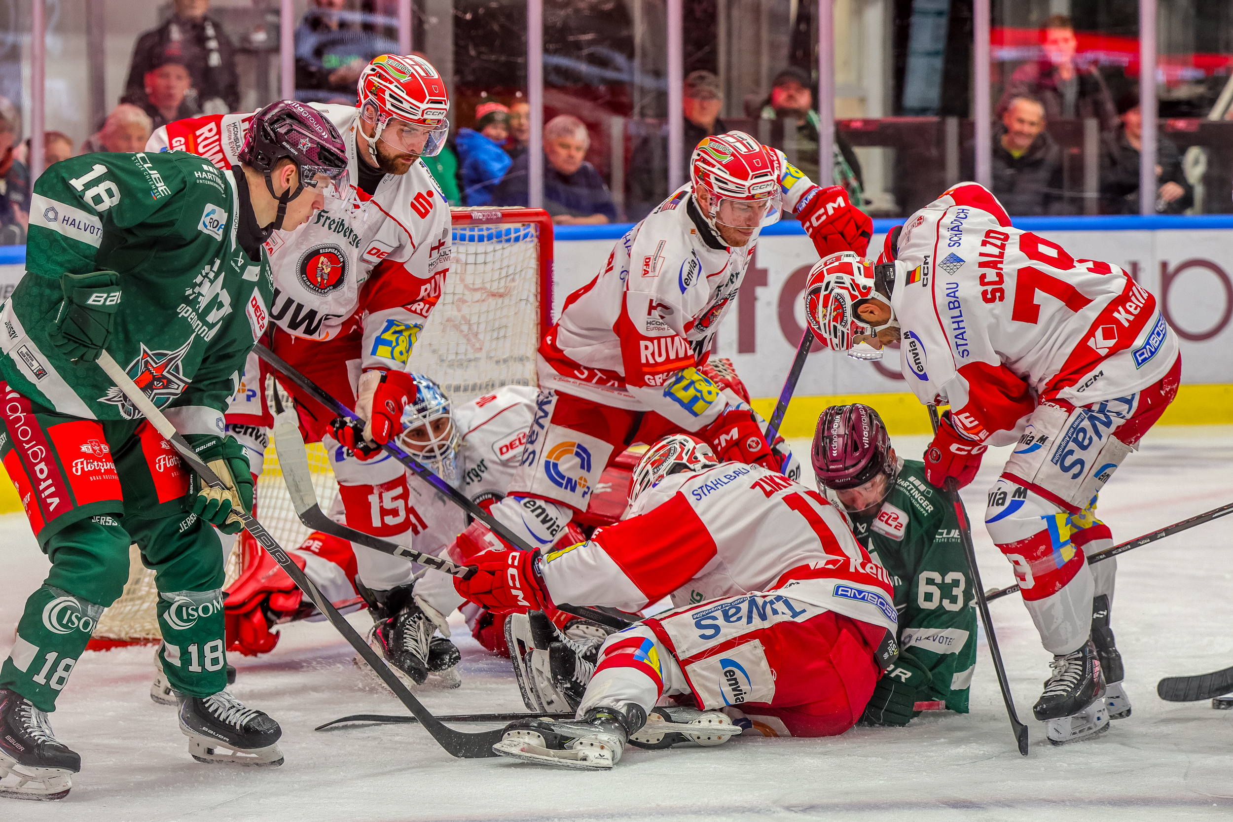 Bereits nach gut einer Minute hätte Scott Feser für die Starbulls gegen seinen Ex-Verein treffen können, scheiterte bei einem Alleingang aber an Crimmitschaus Torwart Kevin Reich. Der reagierte auch gegen den von hinter dem Tor in den Slot fahrenden und gefährlich abschließenden Luigi Calce gut (6.). Als Maximilian Adam bei völlig freier Schussbahn aus knapp zehn Metern per Schlagschuss knapp am Gehäuse vorbeizielte, kam der Gästekeeper gar nicht zum Reagieren. Insgesamt parierte Reich vor der ersten Pause 16 Schüsse, während Starbulls-Schlussmann Oskar Autio nur dreimal eingreifen musste.