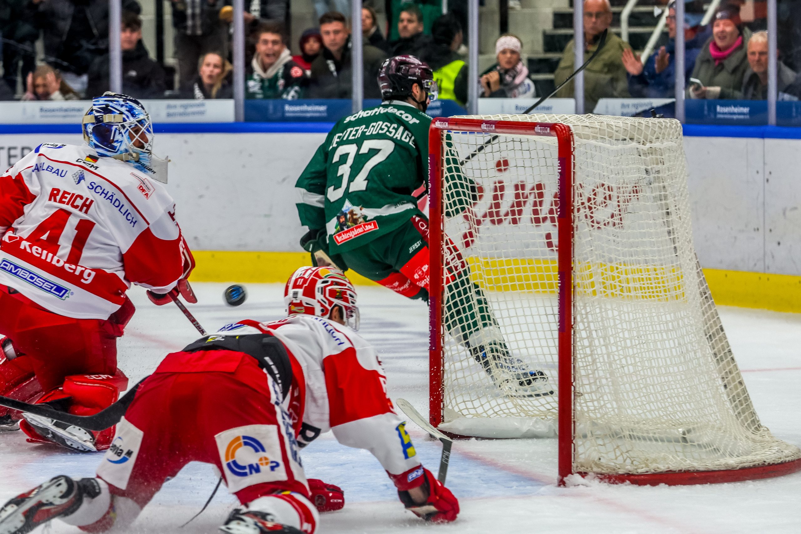 Davor musste Oskar Autio gegen den allein auf ihn zufahrenden Mirko Sacher einen Unterzahltreffer der Gäste – dieses Kunststück gelang den Eispiraten in der noch jungen Saison bereits dreimal – verhindern und zeigte sich schließlich auch gegen den frei vor ihm auftauchen Robin Veber auf dem Posten (32.). Im Gegenzug ließ Lewis Zerter-Gossage die große Chance zum zweiten Rosenheim Treffer aus, er zog den eigenen Abschluss dem Querpass auf den mitgelaufenen Sarault vor, zielte aber frei vor Gästekeeper Reich haarscharf am linken Pfosten vorbei.