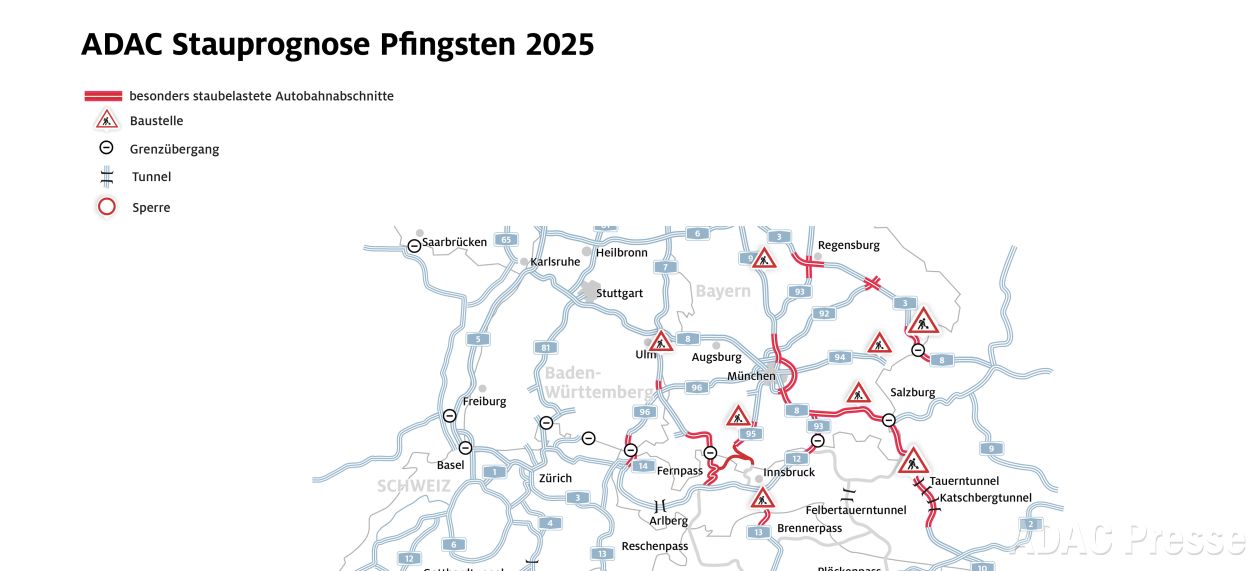 Zum Start der Pfingstferien müssen Reisende auf den Weg in den Süden viel Geduld mitbringen. Grafik: ADAC Südbayern