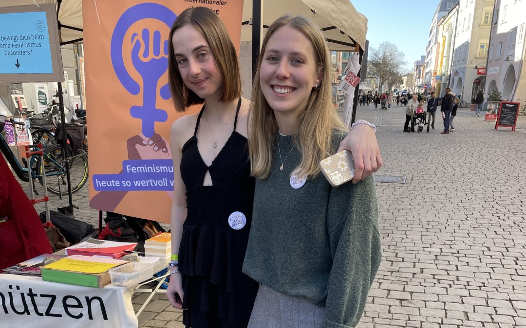 Unter dem Motto „Feminismus – heute so wertvoll wie früher“ spannten die „Omas gegen Rechts“ mit ihrem Aktionsstand den Bogen zum Feminismus in ihrer Jugend in den 70er und 80er Jahren hin zum heutigen Feminismus. „Wenn wir auf die letzten 50 Jahre zurückblicken, ging es im Kern meist um zwei Themen – nämlich unsere Körper und unsere Finanzen,“ sagte die Sprecherin der „Omas gegen Rechts“ Rosenheim, Claudia Lübbert, „und das gilt auch heute noch für die relevanten feministischen Themen.“