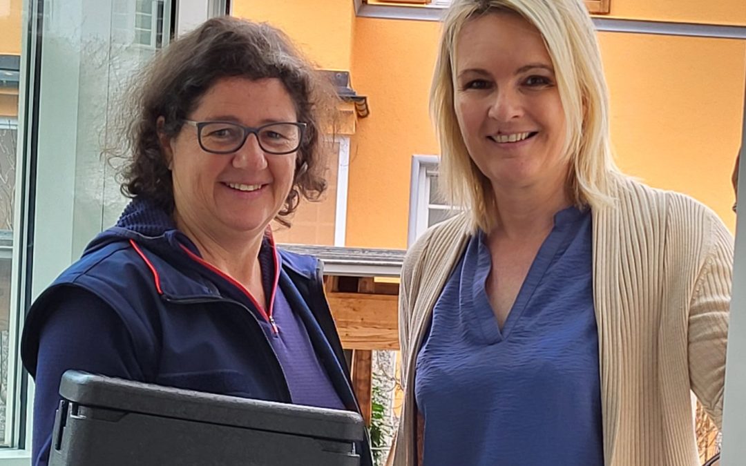 (Quelle: Pressemitteilung Malteser Bezirk Ost-Oberbayern / Beitragsbild: Gemeinsam mit Malteser Mitarbeiterin Sonja Hartl bringt Ski-Olympiasiegerin Hilde Gerg Mittagsmenüs zu Kunden im Berchtesgadener Land. Copyright Margit Schmitz/Malteser)