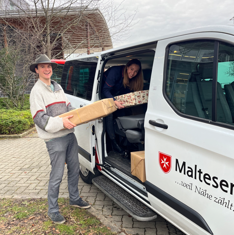 Mit vereinten Kräften wurden die 44 Glücksbringer-Hilfspakete schnell verladen: Janosch Sülz, Student an der TH Rosenheim, packte gemeinsam mit Antonia Paluch, Malteser Helferin im Freiwilligen Sozialen Jahr. Foto: Copyright Malteser