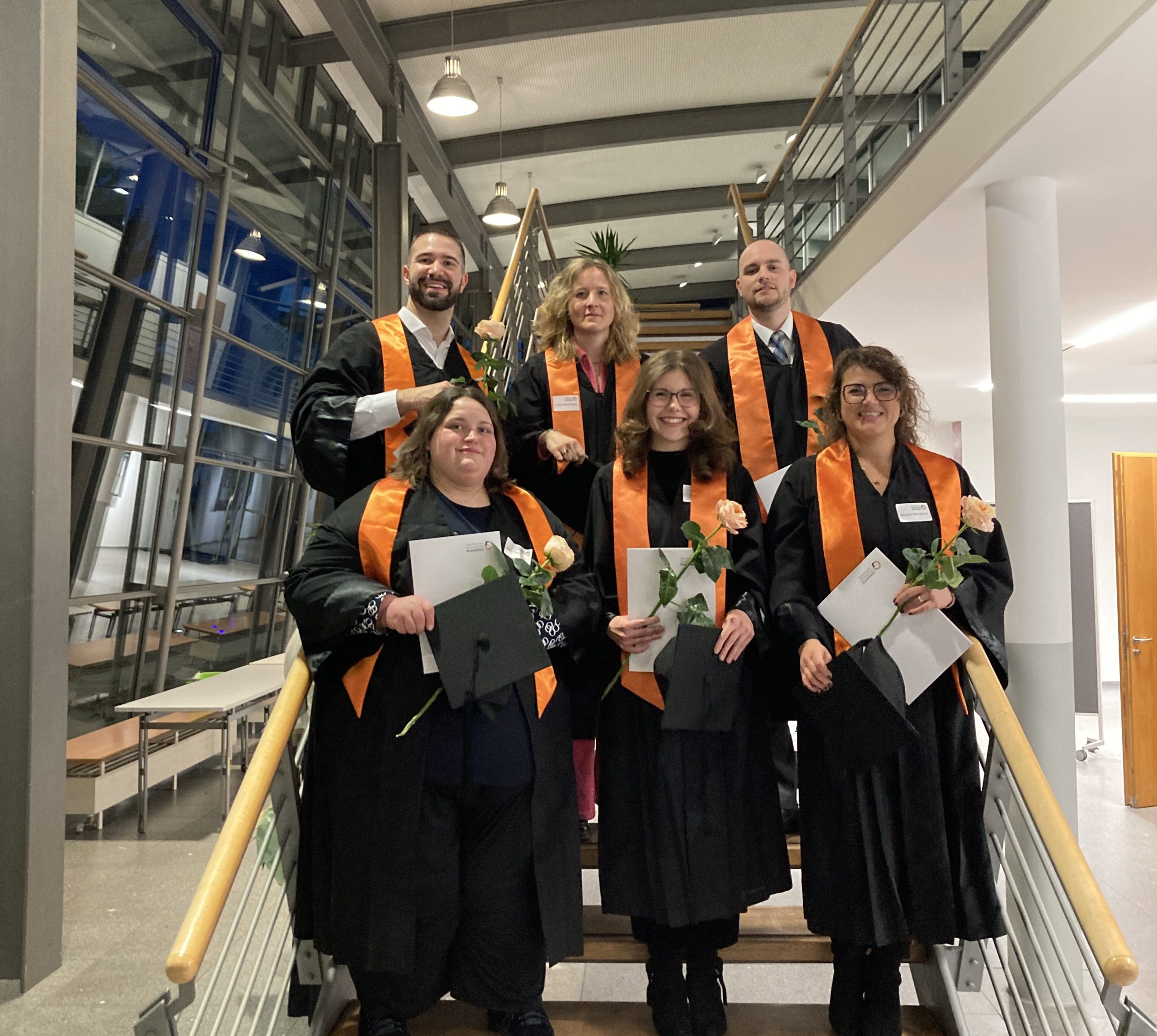 Ein Teil der ersten Absolventen des Masterstudiengangs Versorgungsforschung und -management der TH Rosenheim bei der feierlichen Abschlussveranstaltung in Talaren: (hinten, v.l.) Lukas Utzmeier, Louisa Blankenstein, Oliver Plechinger; (vorne, v.l.) Kathrin Deisenhofer, Laura Peichl, Margarethe Biehl-Kantoch. Die restlichen Mitglieder der Kohorte konnten an diesem Tag nicht teilnehmen. Foto: Copyright Magdalena Hilzensauer