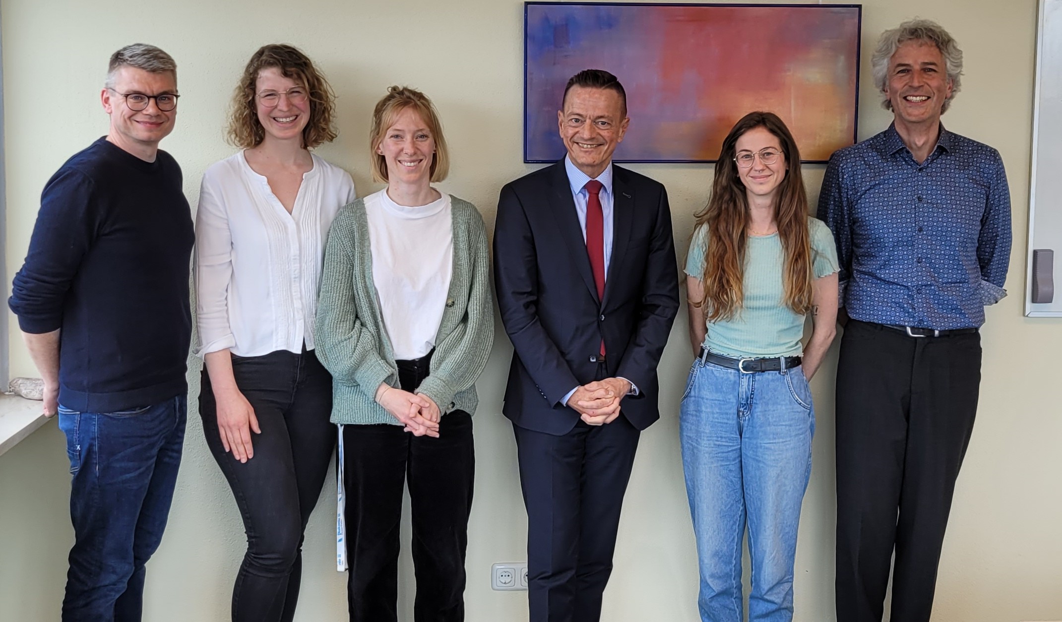 BU: Der bayerische Integrationsbeauftragte und Mitglied des Landtags Karl Straub (vierter von links) mit dem fachlichen Leiter der TAFF-Initiative, Dr. Stefan Schmid (ganz rechts) und Mitarbeitenden der Diakonie Rosenheim (v.l.n.r. Thies Schlüter, Marion Schlosser, Nicola Reith und Johanna Mur). Foto: Christina Neumann (StMI)