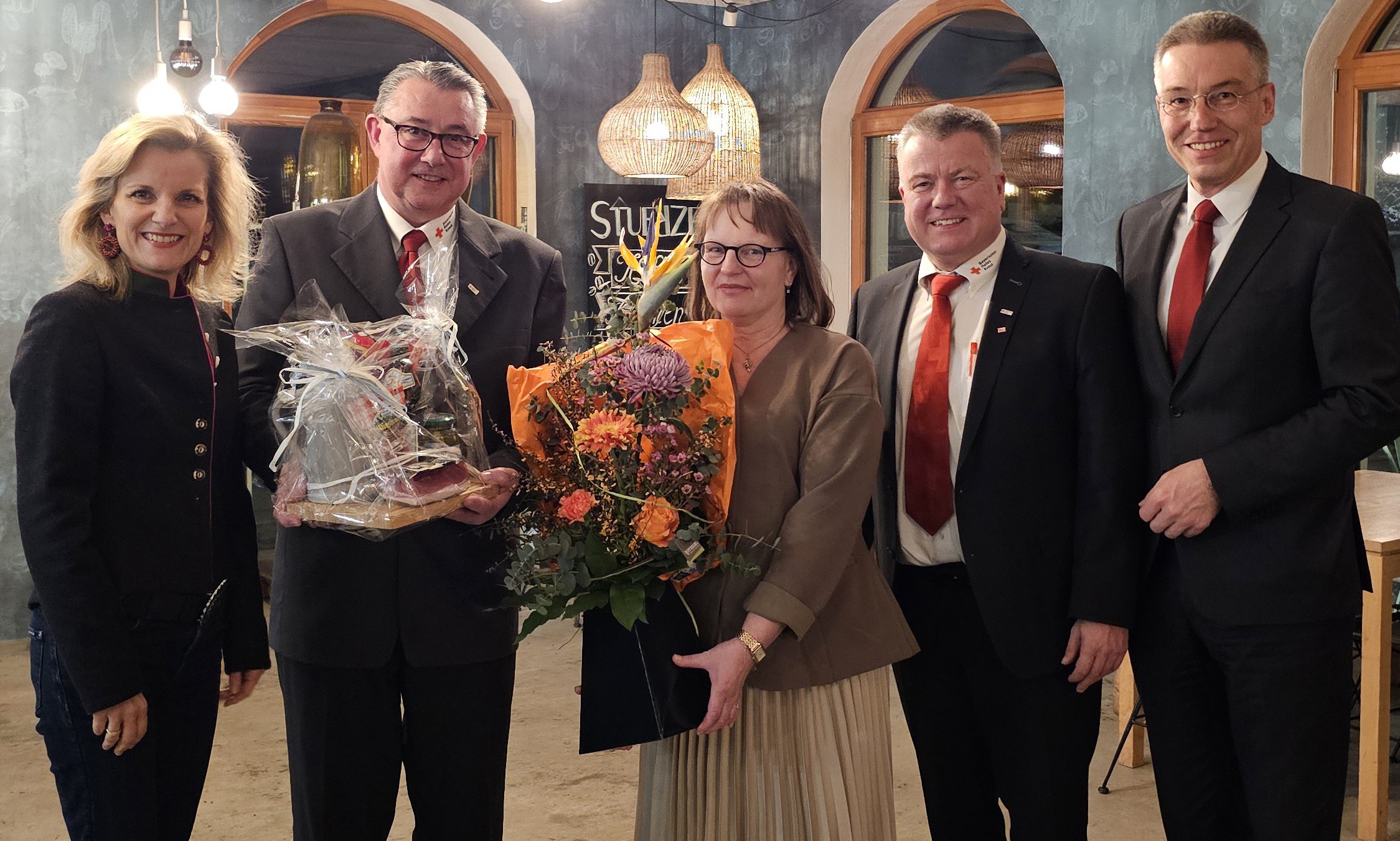Verabschiedung von Thomas Neugebauer. Foto zeigt von links: Daniela Ludwig, Thomas Neugebauer, Iris Neugebauer (Ehefrau), Direktor Martin Schmidt (BRK-Kreisgeschäftsführer) und Otto Lederer. Foto: Copyright BRK Kreisverband Rosenheim