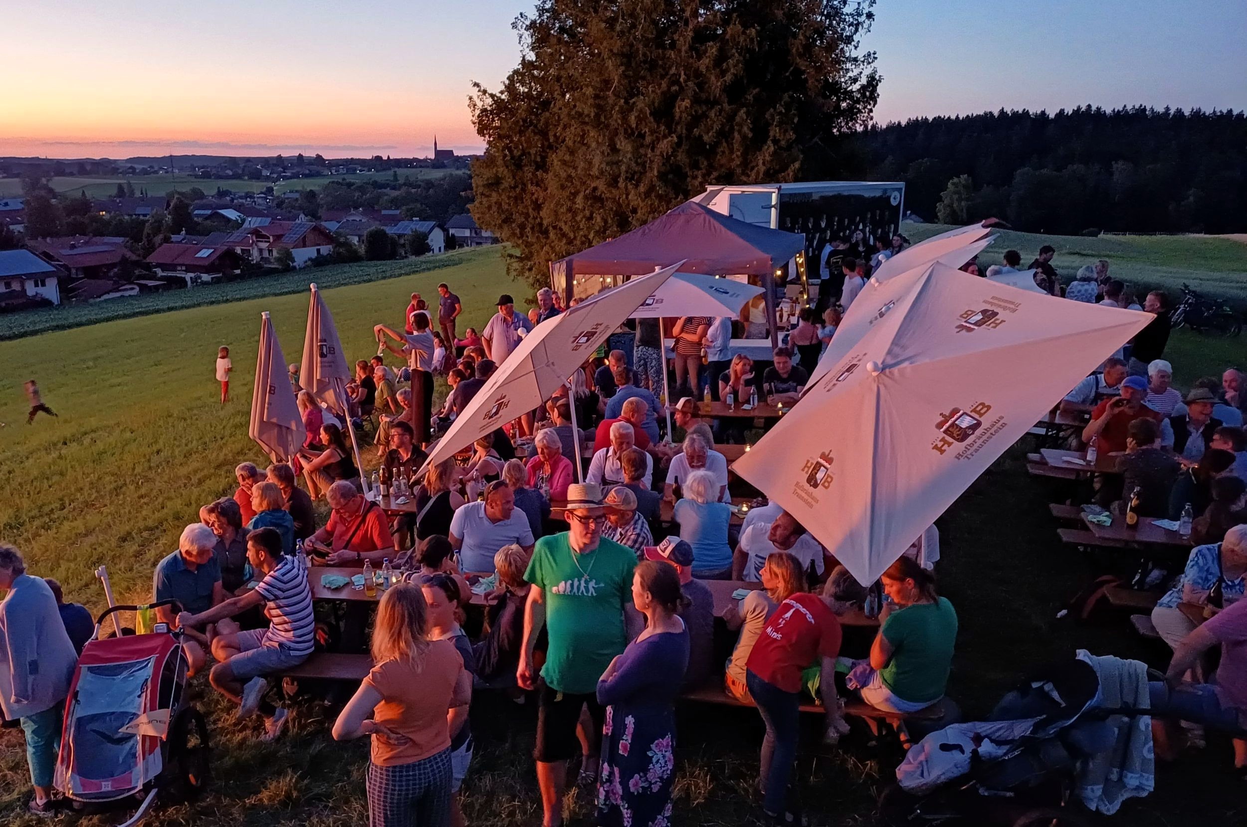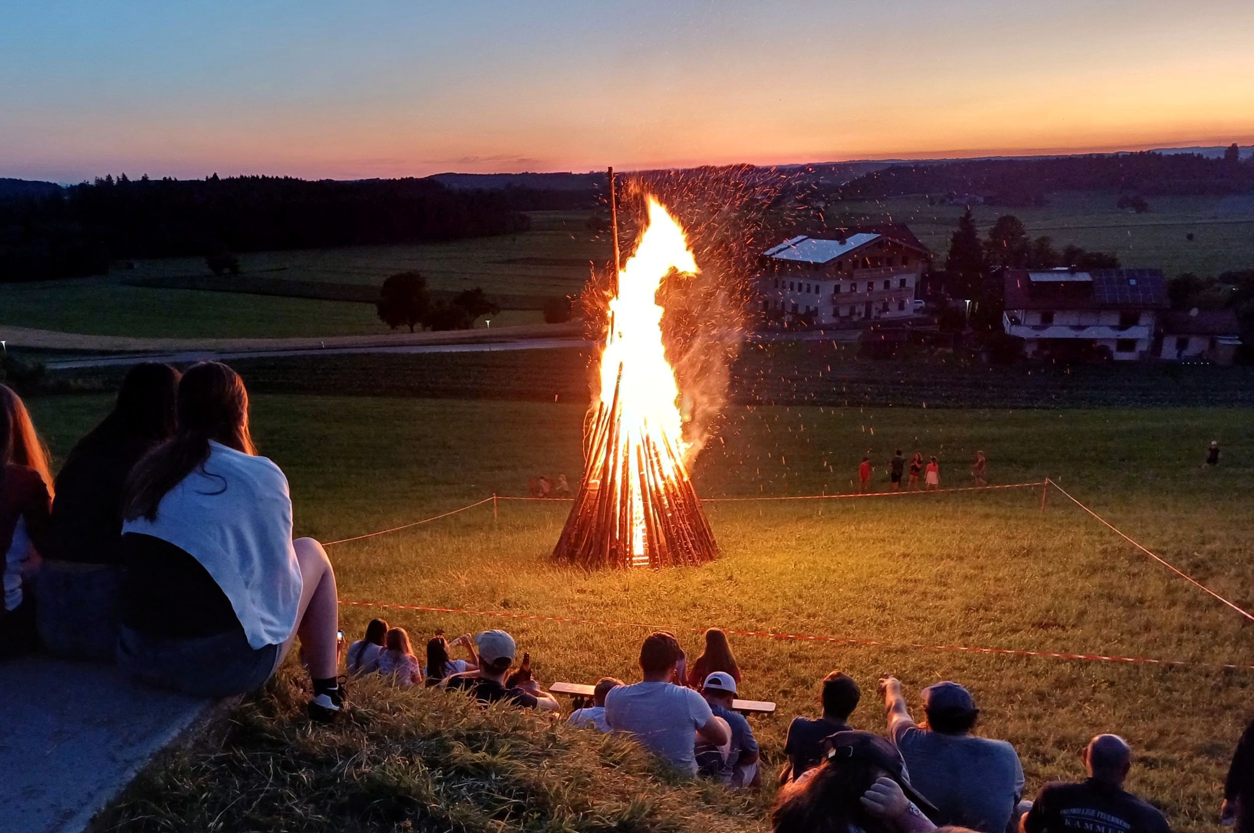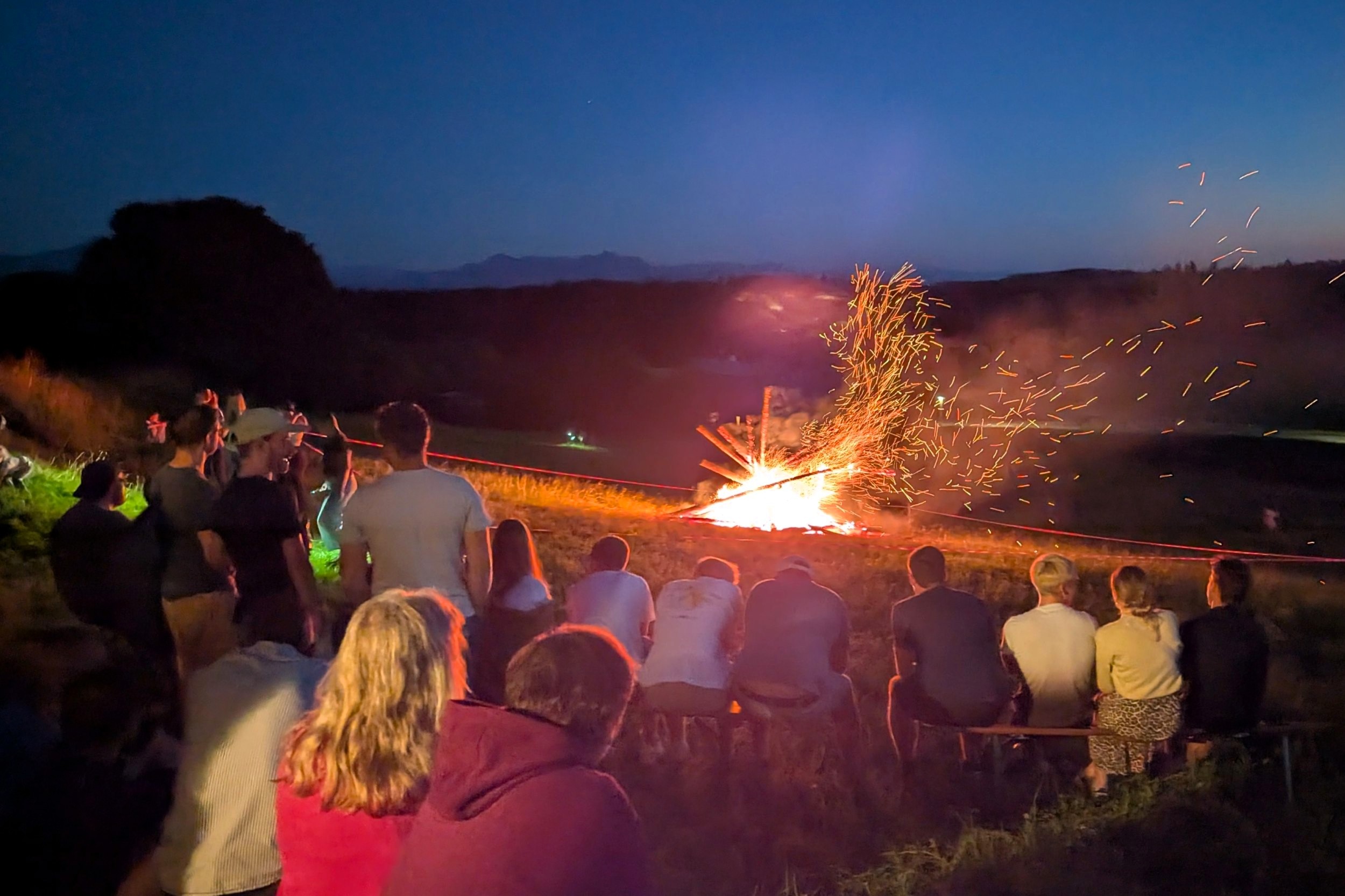 Viele Gäste folgten der Einladung und durften neben einem perfekten Sommerabend einen traumhaften Blick in die Chiemgauer Alpen und einen wunderbaren Sonnenuntergang erleben. Gemütlich saß man am Lagerfeuer oder an den aufgestellten Biertischen und hat den Abend in entspannter Atmosphäre und netten Gesprächen genießen können. Bis tief in die Nacht loderte das Feuer, ehe sich die Gäste sichtlich zufrieden auf den Heimweg machten.