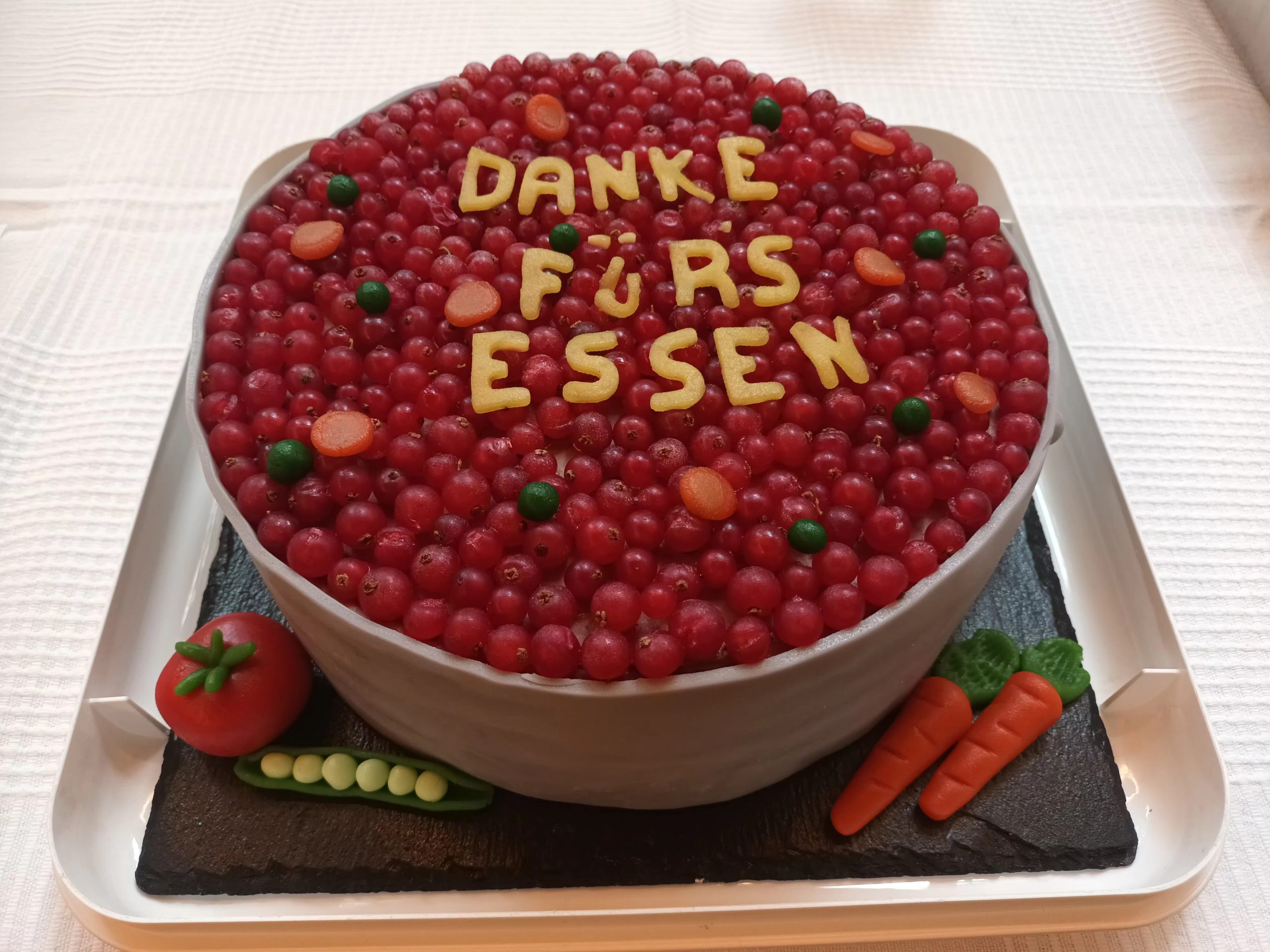 „Diese Torte ist ein Symbol unserer großen Wertschätzung“, betonte Reischl bei der Übergabe. „Sie alle setzen sich mit großem Engagement dafür ein, dass Kinder in Ihrer Einrichtung gut und gesund essen können – Tag für Tag.“