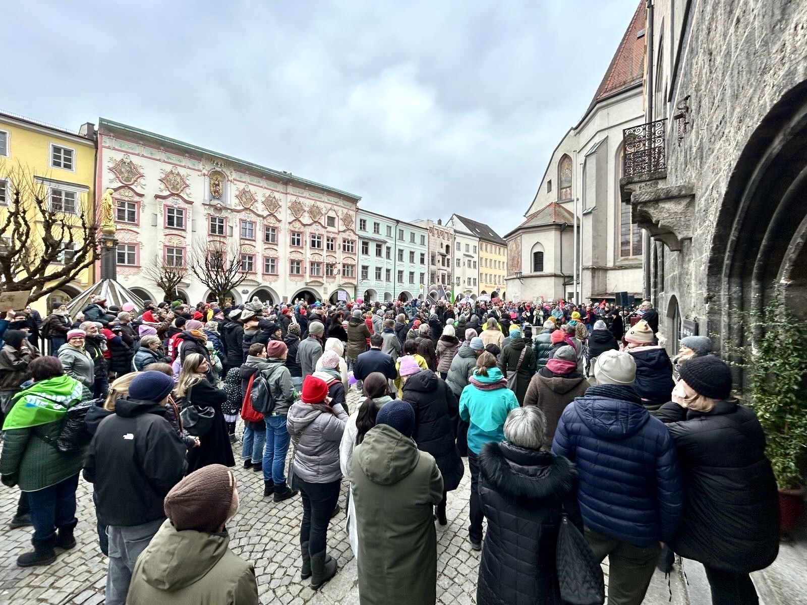 Wasserburg / Landkreis Rosenheim – Rund 500 Menschen versammelten sich am Samstag (1.2.2024) trotz Kälte und kurzfristiger Ankündigung in Wasserburg am Inn, um gemeinsam ein Zeichen gegen Rechts zu setzen. Hand in Hand umschlossen sie das Rathaus, begleitet von bunten Luftballons, Fähnchen und Schildern, die die Vielfältigkeit und den Zusammenhalt symbolisierten.