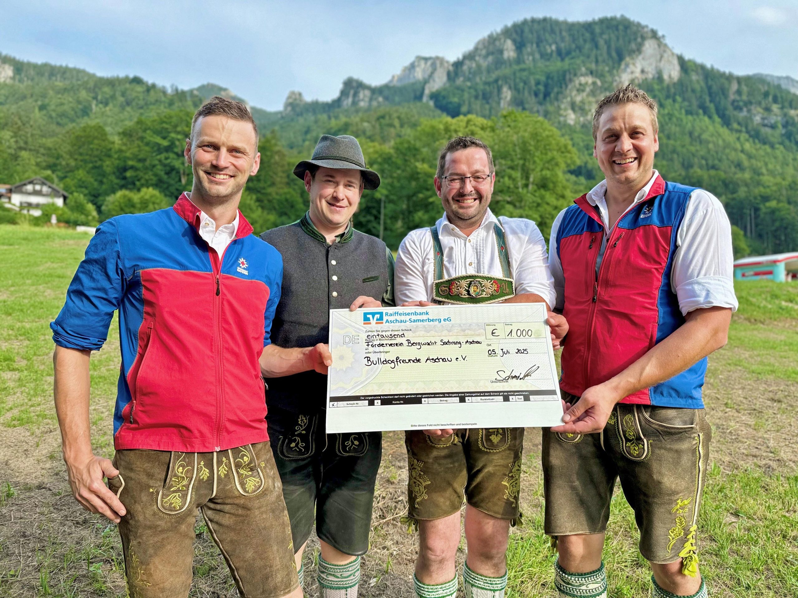 Bereitschaftsleiter Thomas Riepertinger (links) von der Bergwacht Sachrang-Aschau freut sich über die großzügige Spende, die ihm von Alois Schmid junior (Zweiter von links) und Sebastian Aringer (Dritter von links) von den Bulldogfreunden Aschau überreicht wurde. Auch Andreas Angermaier (rechts), zweiter Vorsitzender des Fördervereins Bergwacht Sachrang-Aschau e.V., zeigte sich dankbar über die willkommene Finanzspritze – eine Unterstützung, die bei der ehrenamtlichen Arbeit sehr geschätzt wird. Mit dieser „maschinenschweren“ Geste unterstützen die Bulldog-Freunde die wertvolle, ehrenamtliche Arbeit der Bergwacht in der Region – ein starkes Zeichen aus der Mitte der Gemeinschaft.