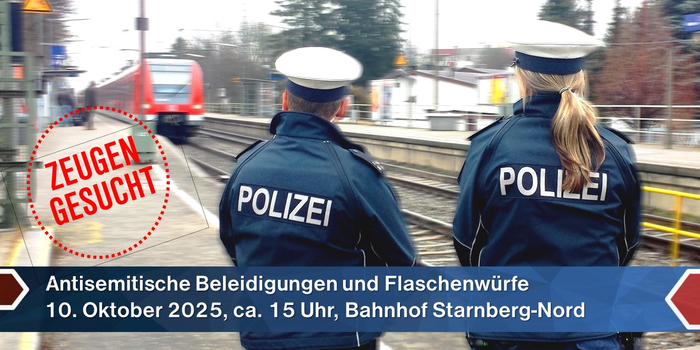 Starnberg – Am Freitag (10.10.2025), gegen 15 Uhr, beleidigte ein bislang unbekannter Mann am Bahnsteig des Bahnhofs Starnberg Nord mehrere Reisende mit judenfeindlichen Parolen. Zudem warf der Täter mehrere Glasflaschen auf den gegenüberliegenden Bahnsteig. Ob dabei gezielt Personen getroffen werden sollten, ist derzeit unklar.
