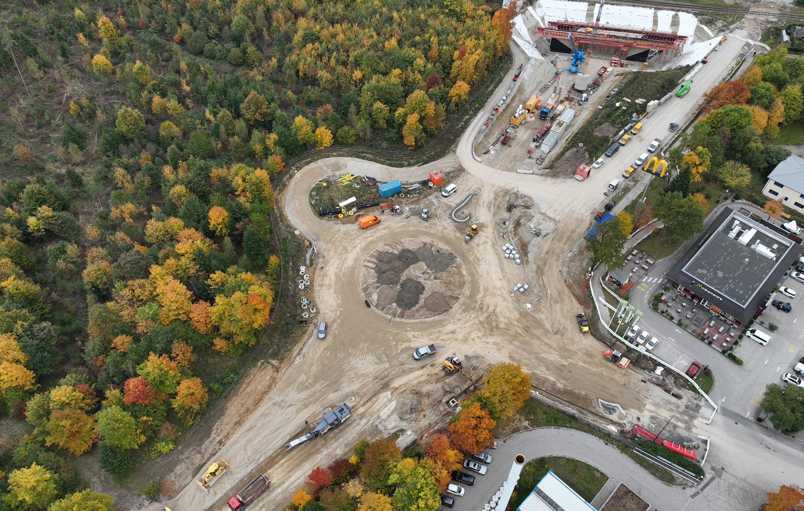 Die Bauphase VI beim Umbau des Knotenpunkts Pürtener Kreuzung ist in vollem Gange und die Arbeiten kommen gut voran. Gearbeitet wird rund um die Teplitzer Straße; hier entstehen ein Kreisverkehr sowie alle dafür nötigen Anschlüsse. Gebaut wird außerdem die Bahnbrücke, unter der später die Staatsstraße 2091 geführt wird: die Züge fahren oben drüber, die Fahrzeuge unten durch.